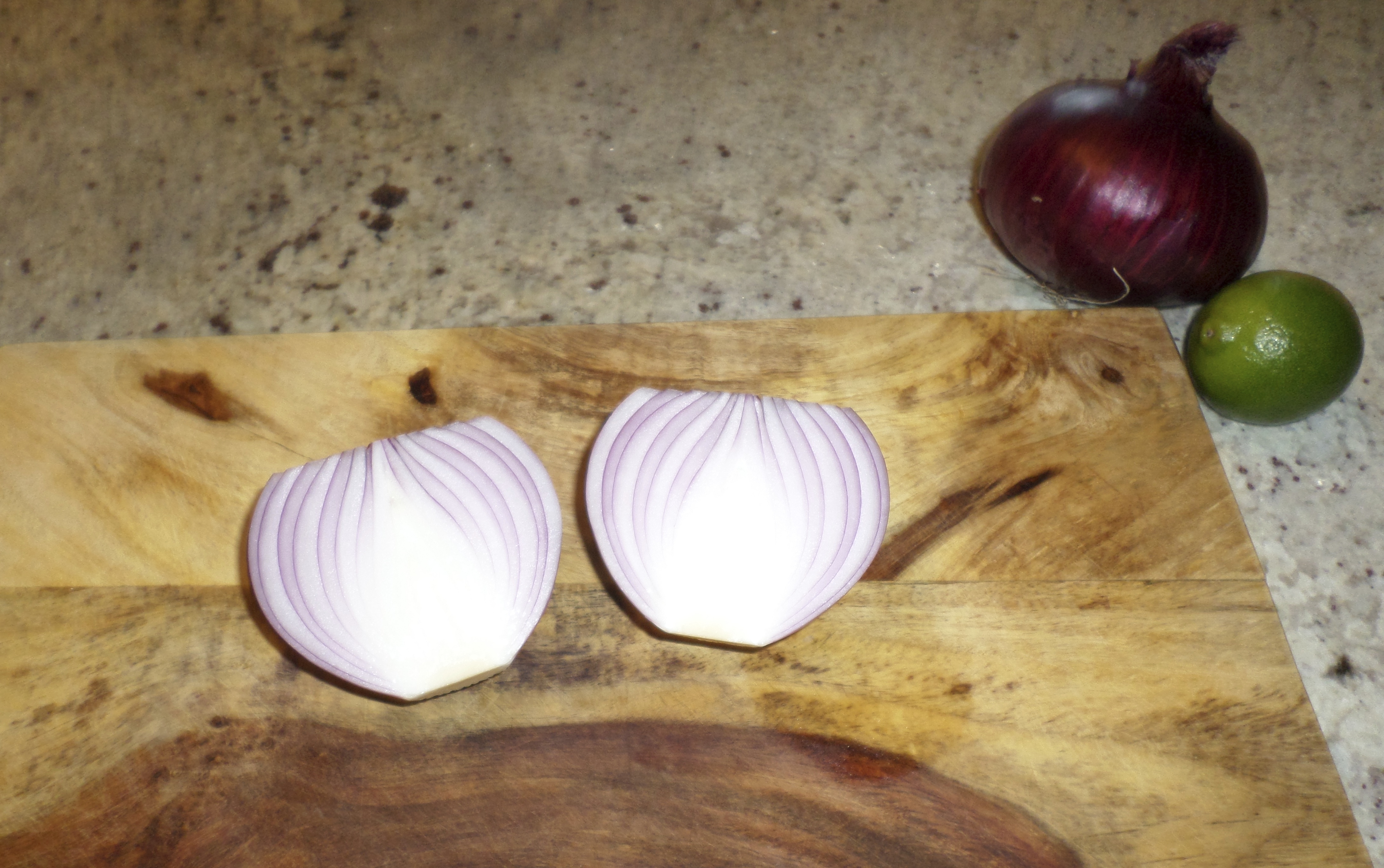 You can use either flour or corn tortillas. But the choice does make the dish different: Flour tortillas make a softer dish and the corn tortillas make a rather heartier dish. I would not mix and match though, as they have different cooking times. Use only all flour tortillas or only all corn tortillas, and not 2 flour tortillas and 2 corn tortillas together. In Texas, it is common to see tortillas that are a blend of flour and corn (“Mixla” tortillas). Those are my favorite for everyday use. And they are great for migas. Cut all 4 tortillas in half and place them in a stack of 8 halves. Now slice them, still in a stack, the short way, into strips about ½ or ¾ of an inch wide.