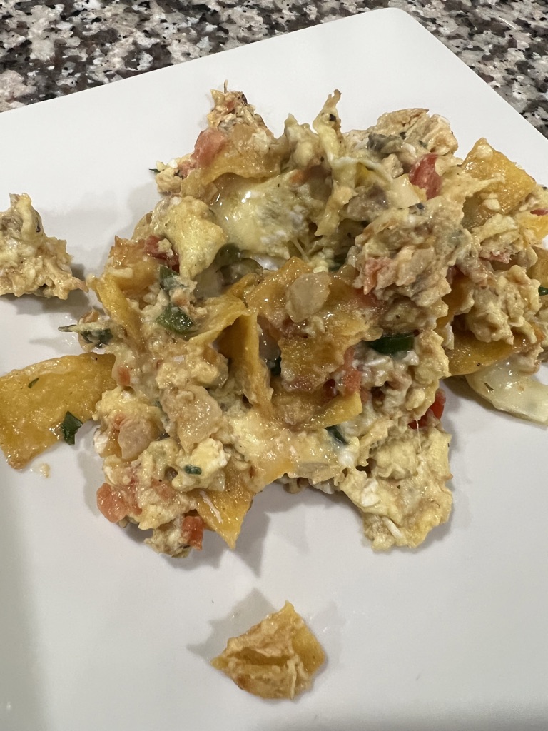 In Mexico, and in Texas, the dish is rather different. The ‘bread’ is stale, leftover tortillas. The tortillas are cut into pieces or strips, lightly fried and scrambled with eggs. It is not typically a meat dish. In Tex-Mex cooking, one often sees tortilla chips scrambled in eggs. I know it sounds rather strange, but it is very popular, very common. Tex-Mex migas are often accompanied by cheese and pico de gallo.